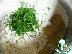 Просеиваем муку в миску, добавляем щепотку соли и мелко рубленный укроп. Вливаем растительное масло.