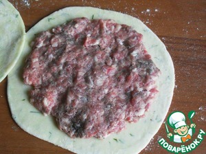 Фарш делим на 7 шариков. Смачиваем руки в воде и шарик фарша превращаем в лепешку, меньшую диаметра теста. Выкладываем на тесто. Я сначала расплющивала на ладони, потом положила на тесто и пальцами расплющила дальше, по тесту.