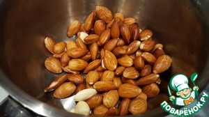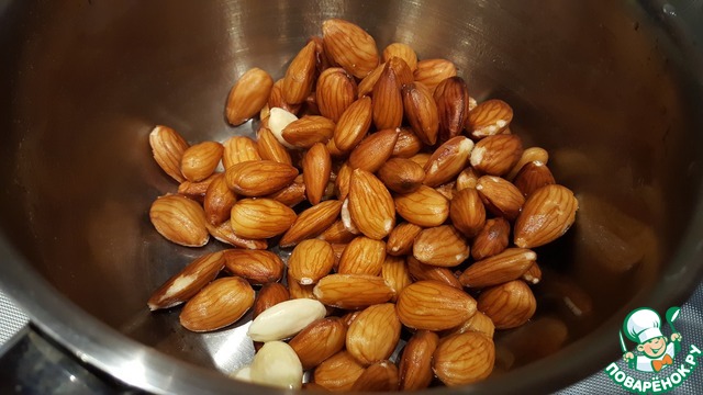 Миндаль помещаем в ковшик, заливаем кипятком и кипятим пару минут на среднем огне. Сливаем воду и заливаем миндаль холодной водой на пару минут.