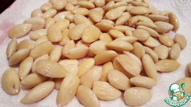 Сливаем воду и легко очищаем орехи. Выкладываем их обсушиться на салфетку. Можно измельчить миндаль в кофемолке или блендере до желаемого состояния - крошка или мука... Мне захотелось оставить орехи целыми.