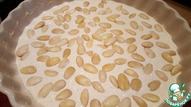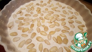 Выложить миндаль. Аккуратно залить миндаль тестом, немного теста оставить.