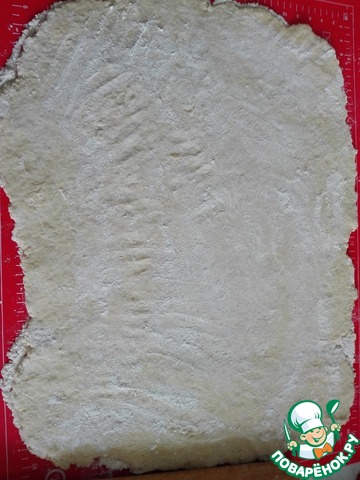 Сильно вымешивать не надо. Тесто немного липкое. Подпылить стол мукой и раскатать тесто, посыпать сверху мукой.