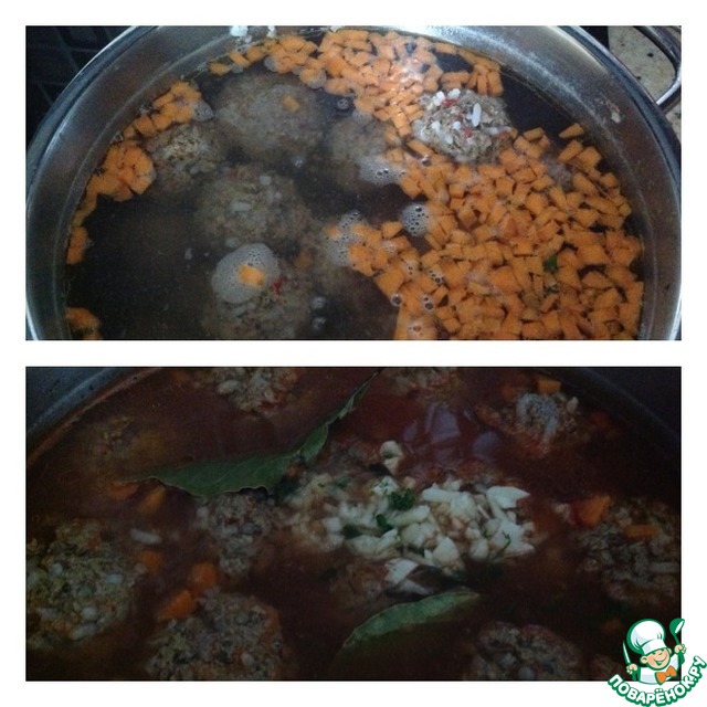 Когда фрикадельки всплывут, добавляем к супу морковь, нарезанную мелким кубиком. Огонь убавляем и варим суп пока морковь не станет альденте. Далее добавляем лавровый лист, чеснок пропущенный через пресс и томат пасту. Варим минут 5.