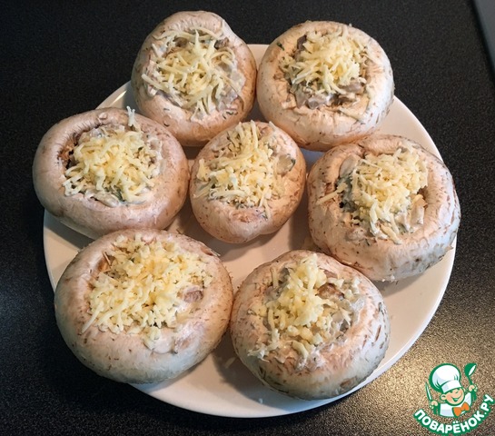 Начиняем шляпки шампиньонов подготовленной заправкой, сверху украшаем тертым сыром. -