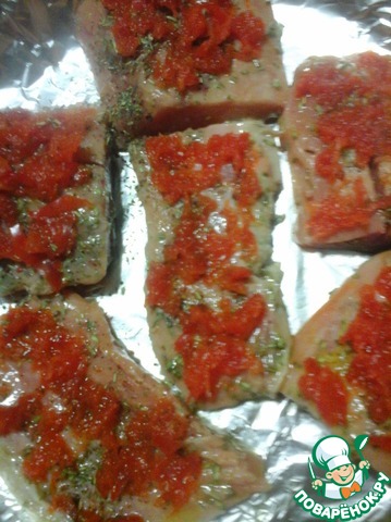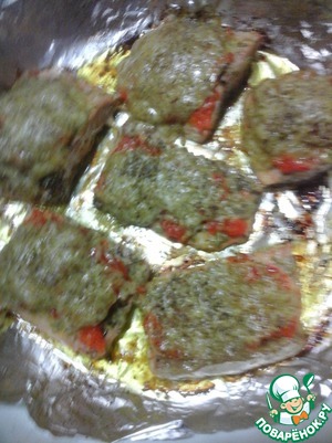 Аккуратно нанести болгарский перец на каждый кусочек рыбы.