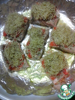 Достать из духовки рыбу, посыпать сыром и отправить обратно примерно на 5 минут.