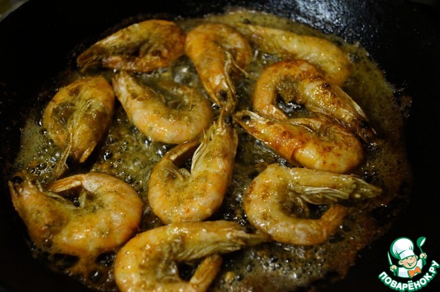 Обжарить отварные креветки с двух сторон на среднем! огне, до слегка золотистого колера. Следите чтобы специи не подгорали.