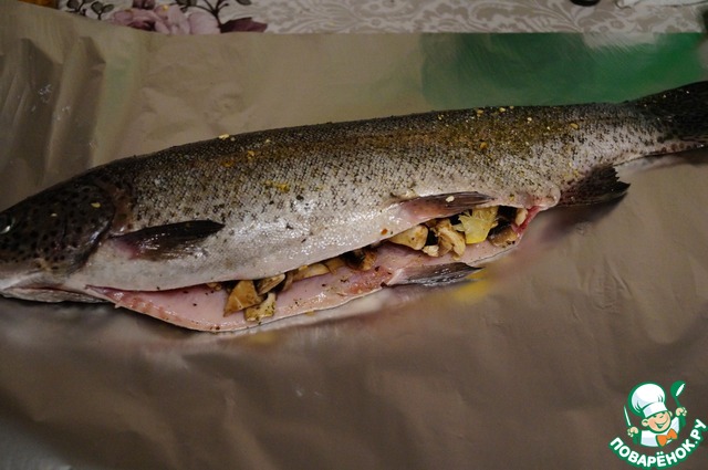 Рецепт «Радужная форель, запеченная с шампиньонами»: