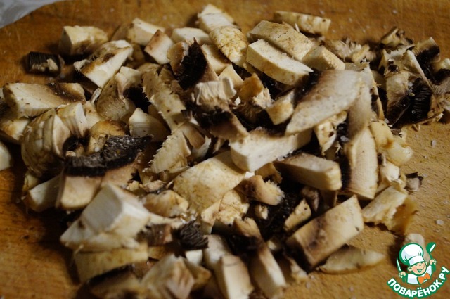 Шампиньоны нарезать кубиками, посолить по вкусу.