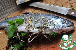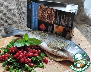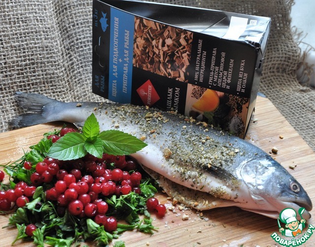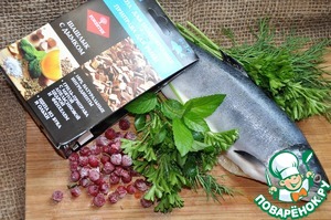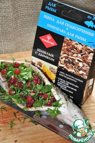 Рыбку натереть внутри и снаружи специями фирмы FORESTER и набить брюшко зеленью с ягодами.