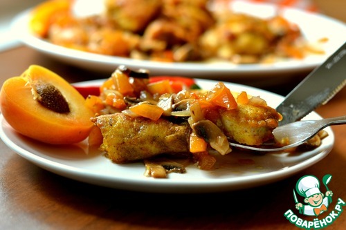 На тарелку выкладываем абрикосово-грибной гарнир, а на него выкладываем "Желтое" мясо.