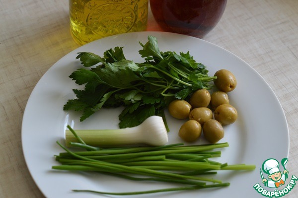 • 3. Хорошо вымешать фарш, накрыть и отставить. Для соуса измельчить зеленый лук, чеснок, оливки и петрушку. Добавить оливковое масло и бальзамический уксус.