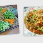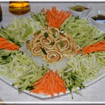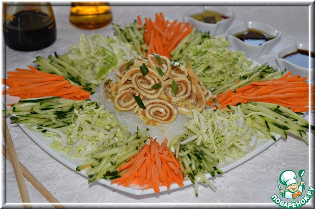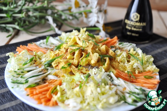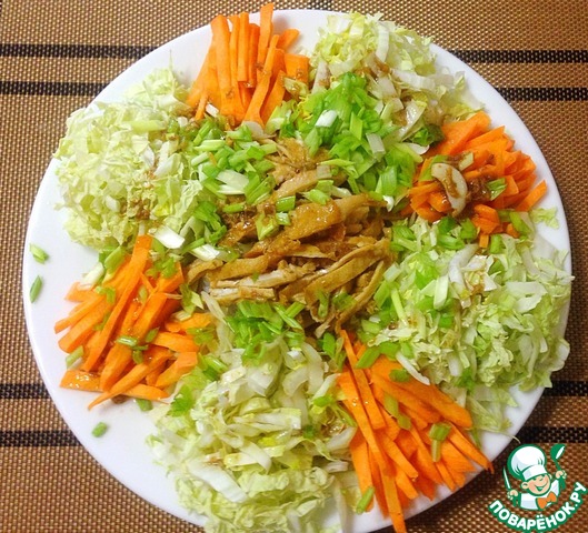 Этот салат уходит своими "корнями" в далёкие 90-ые. Тогда моя мамочка начала ездить в Китай туристкой (у нас до границы 30 км) и привезла оттуда этот рецептик. Делали его очень часто, удивляя гостей, а потом рецептик был забыт. И вот недавно вспомнила. За оформление (аутентичность) отвечаю полностью, а вот соус придумала сама, хотя это классический соус для китайских салатов.