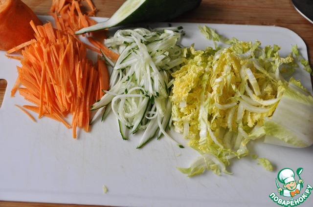 Морковь, огурец и пекинскую капусту режем (натираем) тонкой соломкой.