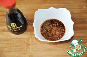 Смешиваем соевый соус Kikkoman, рисовый уксус, кунжутное и оливковое масло, имбирь, кориандр, сахар, хлопья перца чили, тёртый чеснок. -