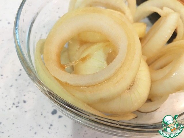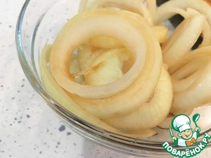 Лук порезала кольцами и 5 минут также "вымочила" в воде с соевым соусом.