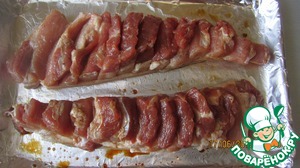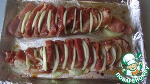 Мясо порезать гармошкой по 1 см (надрез делать не до конца), Посолить поперчить сбрызнуть соевым соусом и положить на смазанный маслом противень.