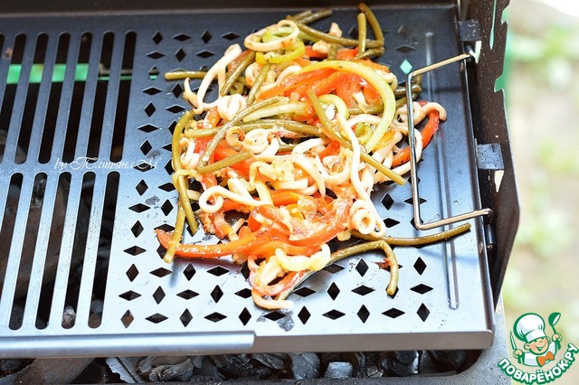 Выложить салат на противень и готовить на углях, не более 4 минут, помешивая деревянной лопаткой;