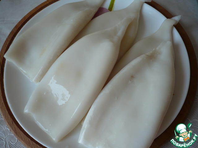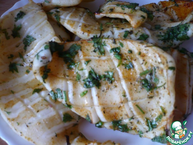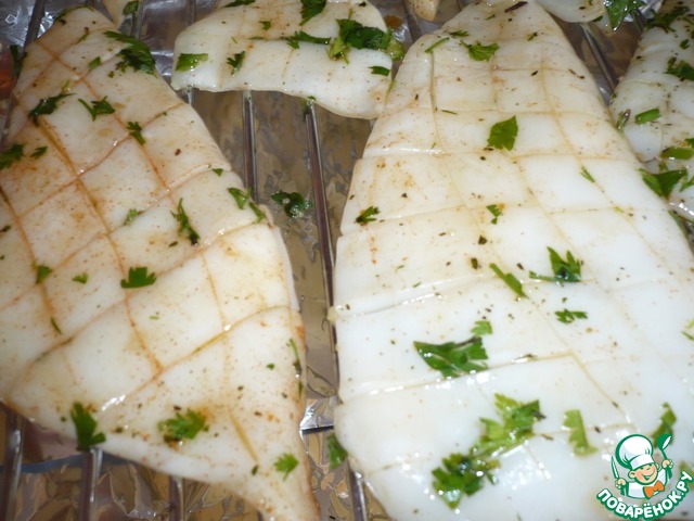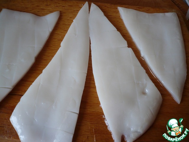 Каждую половинку тушки распластать на поверхности разделочной доски и делаем насечки острым и тонким ножом так, чтобы образовалась сеточка. (Эта сеточка поможет маринаду быстрее и глубже проникнуть в мясо кальмара, а так же позволит жару гриля лучше приготовить волокна кальмара изнутри). -