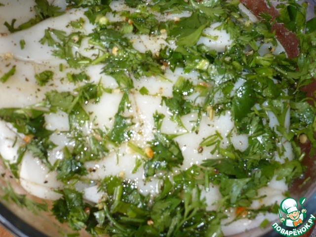 маринад уже сделал свое дело и кальмар практически готов еще до термообработки.