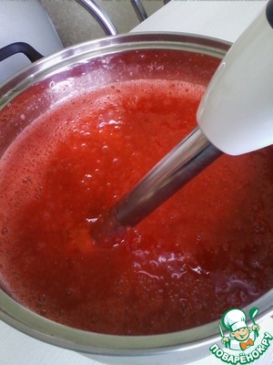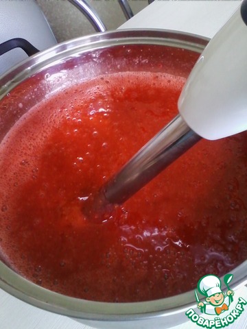 Пюрируем ручным блендером ( можно обычной толкушкой для пюре) блендером получается более однородно, но толкушкой остаются крупные ягодки, что тоже приятно!) Можно выбрать вариант на ваше усмотрение и вкус. После пюрирования убираем в холодильник ( я делала вечером, утром продолжила) это нужно для того, чтобы сахар лучше растаял и смешался с ягодой.