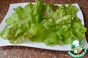 Пасту откинуть на сито, горячей выложить на салатные листья.