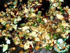 Лук и грибы измельчаем и обжариваем. Добавляем мелко рубленные чеснок и укроп, перемешиваем и выключаем. Даем остыть.