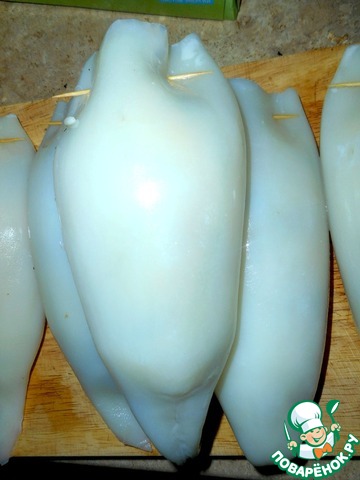 • Тушки кальмара промываем и начиняем. Скалываем зубочисткой.