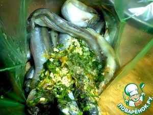 • Мойву моем (не потрошим) обсушиваем и складываем в пакет. Добавляем кинзу, чеснок, цедру, соль, перец и оливковое масло.