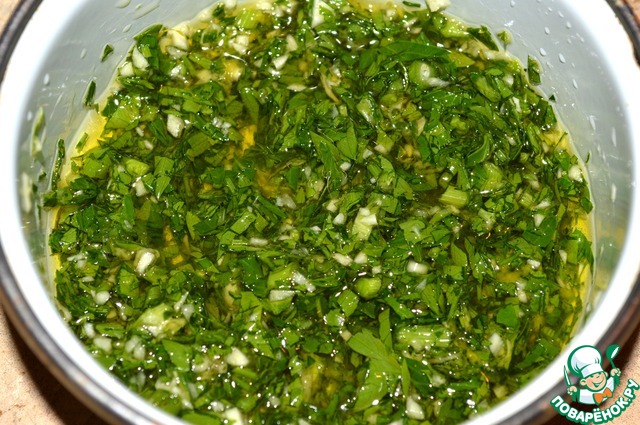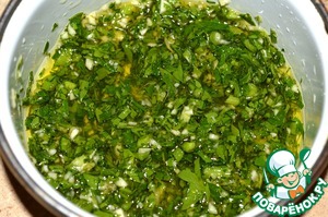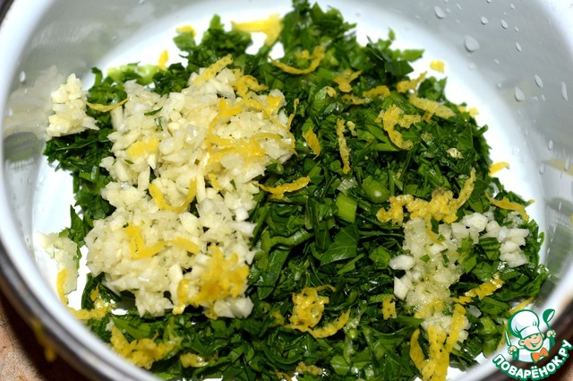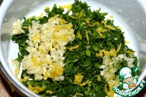 Петрушку и чеснок измельчаем, добавляем цедру и свежемолотый черный перец.