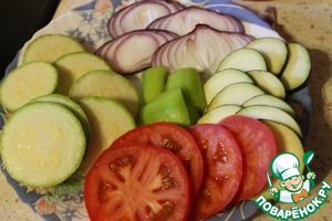 Далее лук и перец болгарский, завершить все кабачком и маринадом. Охладить в холодильнике перед подачей в течение 1 часа. Приятного аппетита!