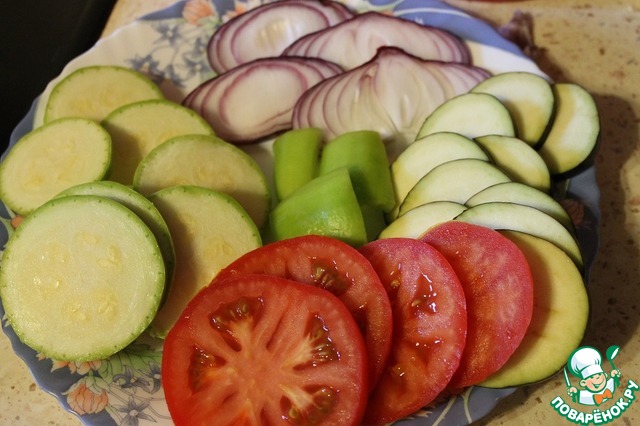 Овощи нарезать кружочками 3 мм.