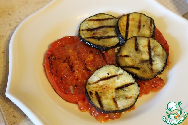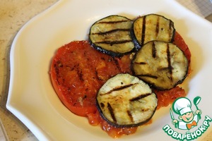На тарелку выложить помидоры, смазать процеженным маринадом, сверху добавить баклажаны, затем опять маринад.