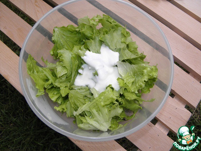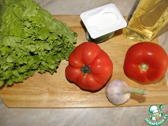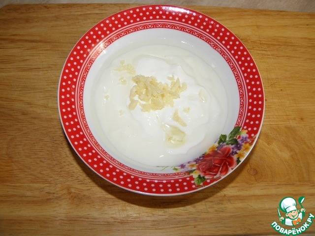 Смешать йогурт с оливковым маслом, добавить пропущенный через пресс чеснок, посолить, еще раз перемешать. -