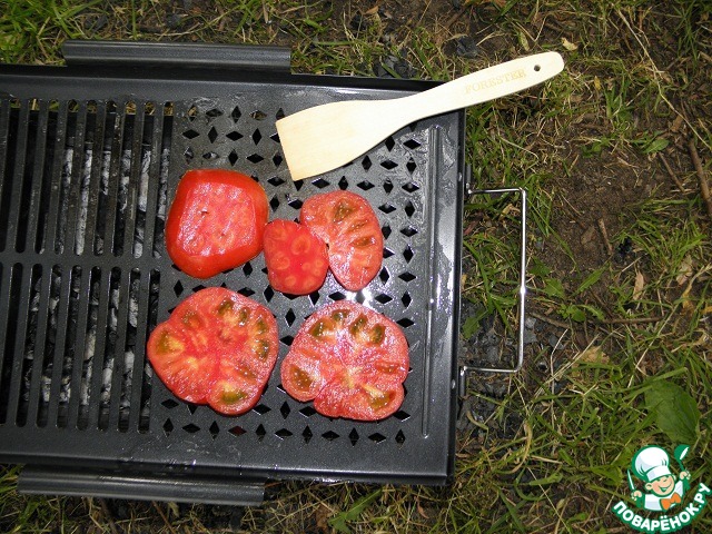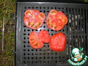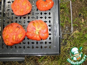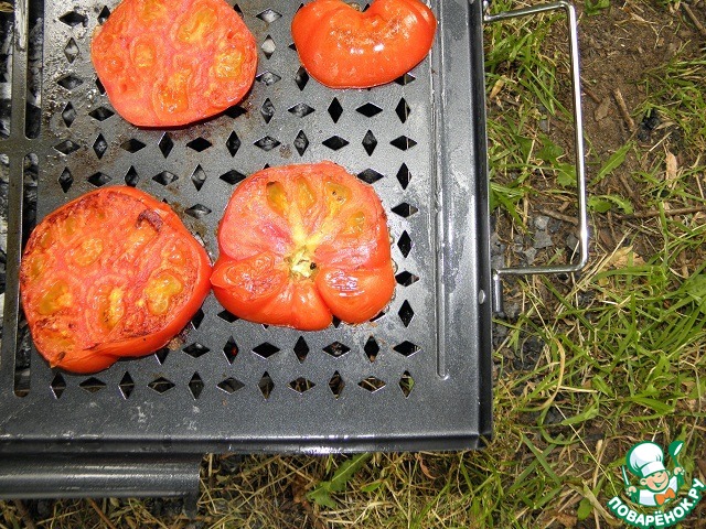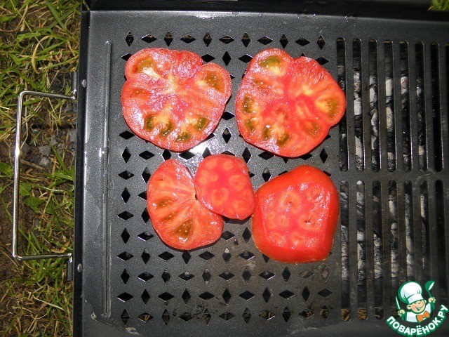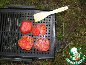 Подготовить угли, помидоры нарезать толстыми кольцами