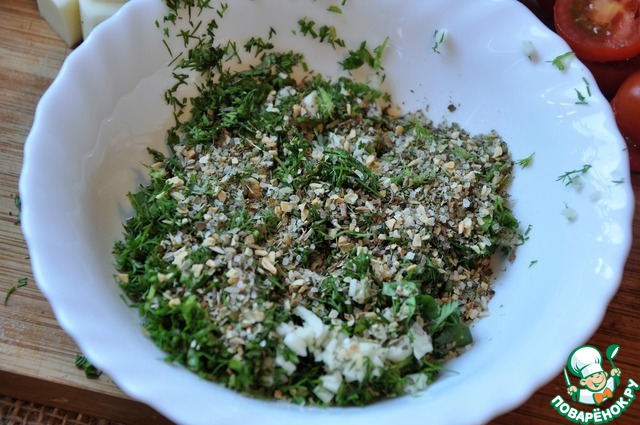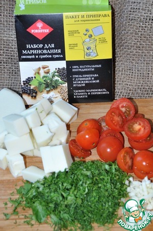 Зелень и чеснок измельчить и соединить со специями фирмы FORESTER из набора для маринования овощей и грибов гриль.
