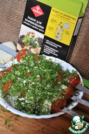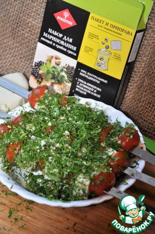 Помидоры и сыр нанизать на шампур. Обсыпать подготовленной зеленью.