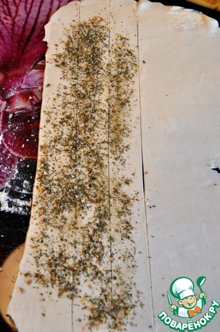 Слоенное тесто раскатать, нарезать и присыпать специями.