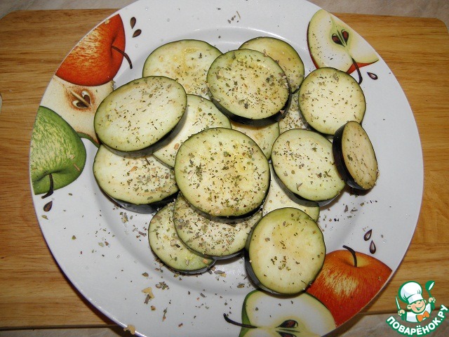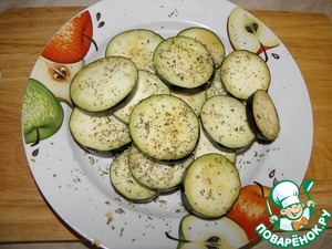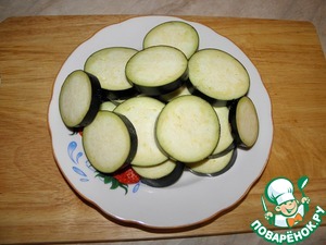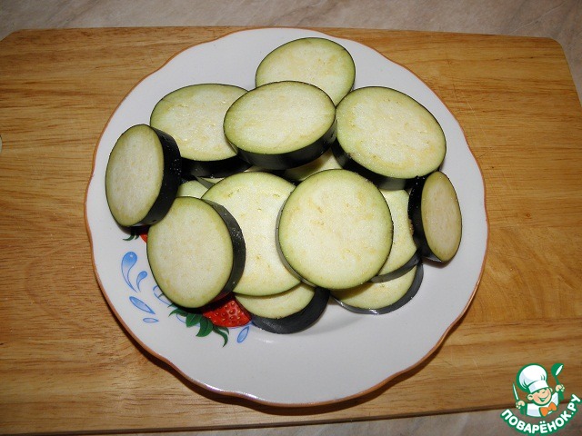 Нарезать баклажаны кружочками ( в районе 1 см), посыпать солью, и оставить на 30 минут.