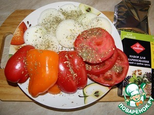 Помидоры и лук нарезать кружочками, перцы на части ( освободить от семечек).
