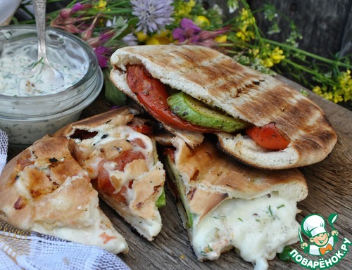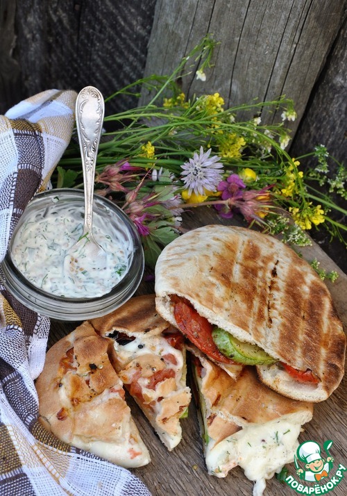 • Для этого рецепта лучше всего воспользоваться лепёшкой "Пита", так как она имеет внутри "кармашек". У питы срезать краешек и раскрыть её. В питу выложите ломтик моцареллы, овощи и немного соуса. Поместите лепешки на решётку мангала и прогрейте минуты 2 с каждой стороны, пока не расплавится сыр.