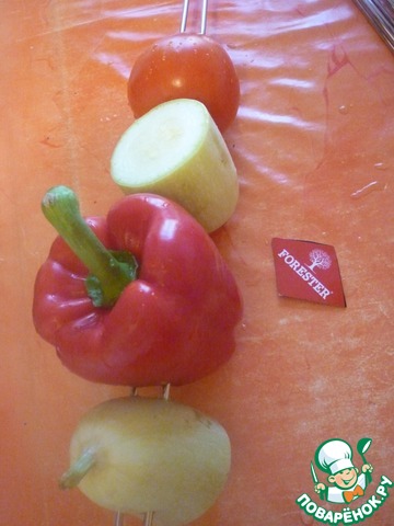 Нанизать на шампуры. Мы использовали замечательные двойные фирмы Forester, которые прекрасно подходят для запекания овощей на углях. -