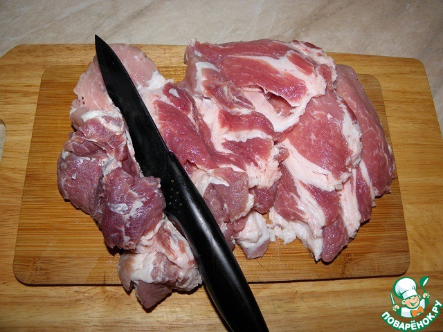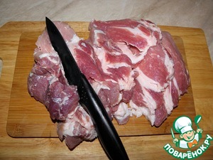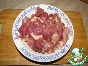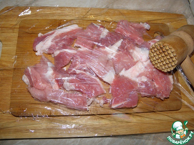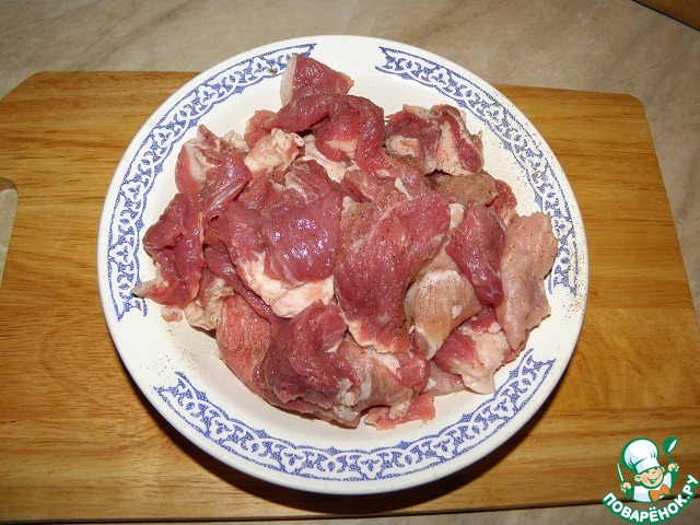 Мясо тонко нарезаем пластинками, затем на небольшие кусочки.