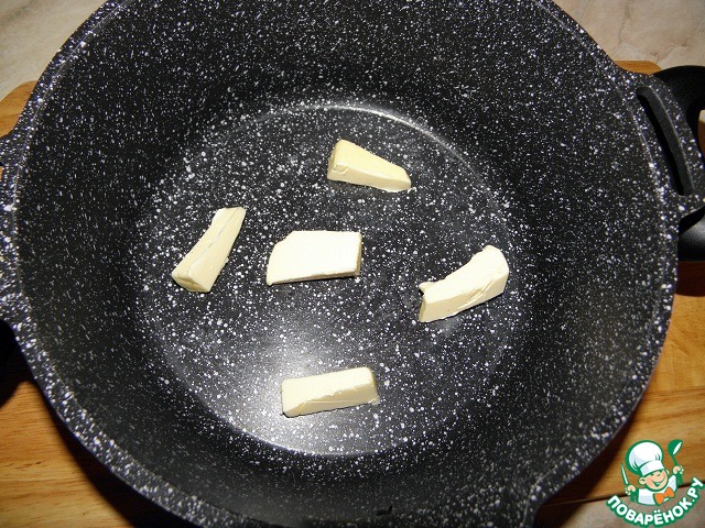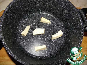 На дно посуды, в которой будите тушить, выкладываем кусками сливочное масло. Масла жалеть не стоит, чем больше, тем лучше.