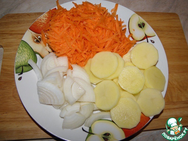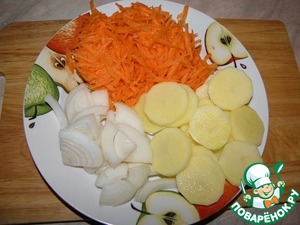 Морковку трем, лук режем, картофель режем тоненькими дольками.