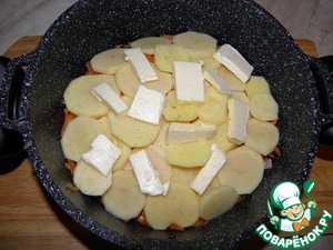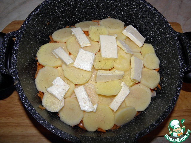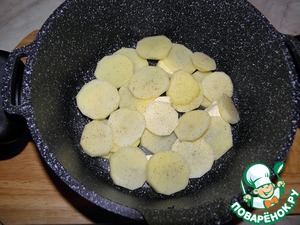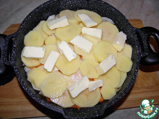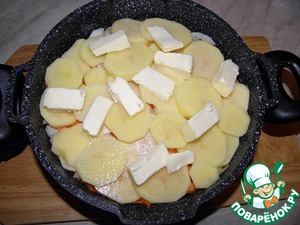 И заканчиваем последний слой картофелем и сливочным маслом. (получается три картофельных слоя, и между ними два мясных слоя с овощами) Плескаем буквально каплю воды, накрываем крышкой, ставим на огонь, как только закипит, сразу убавляем огонь и тушим в районе 1 часа, до готовности (если курица, то будет готово чуть раньше)