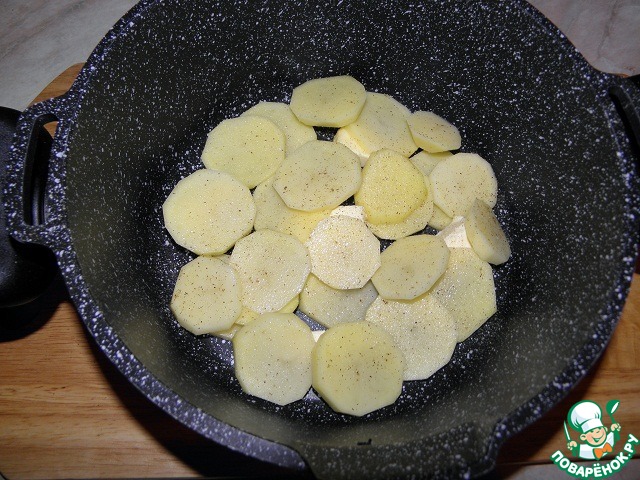 Затем на нее опять слой картофеля и сливочного масла (специи не забываем)