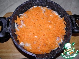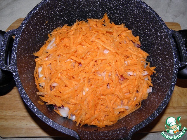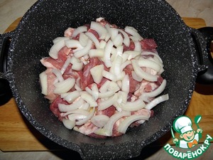 На мясо слой лука, лука с морковкой тоже не жалеть!