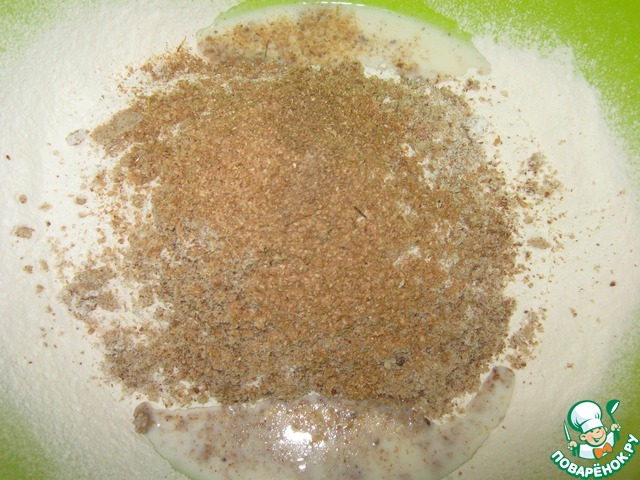 В молочную смесь влить масло, просеять муку. На кофемолке смолоть кунжут и семена льна, добавить в тесто вместе с кориандром и отрубями.