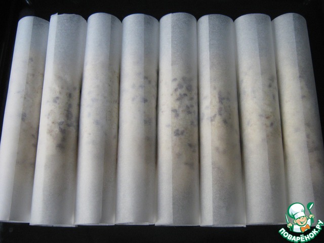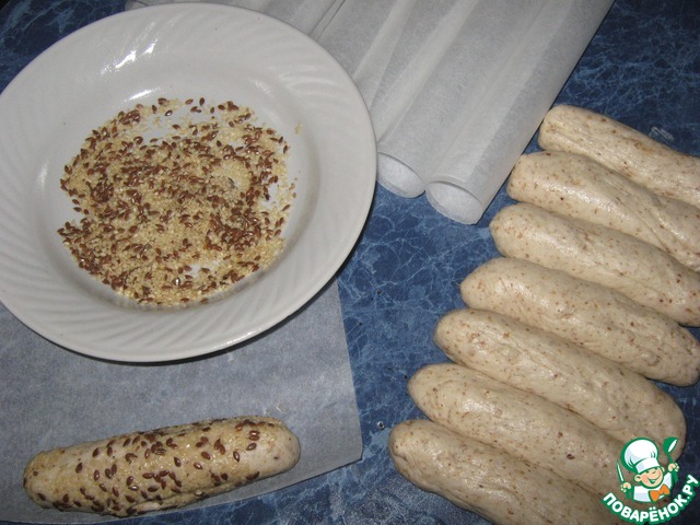 Поделить тесто на равные кусочки, раскатать в жгуты. Подготовить пергамент. Сбрызнуть тесто водой и обвалять в семенах льна и кунжуте. Переложить на пергамент и скрутить в трубочку.
